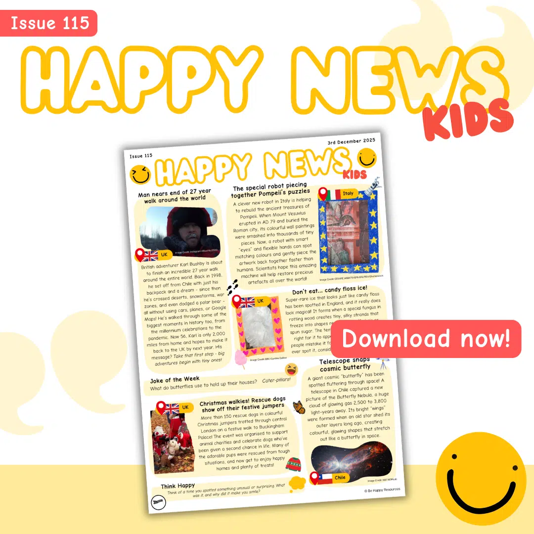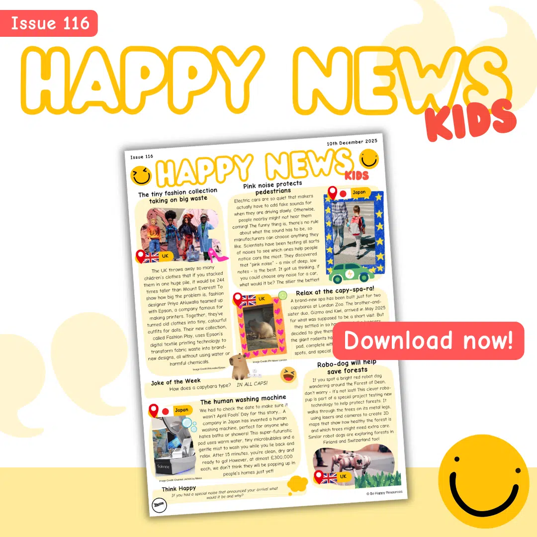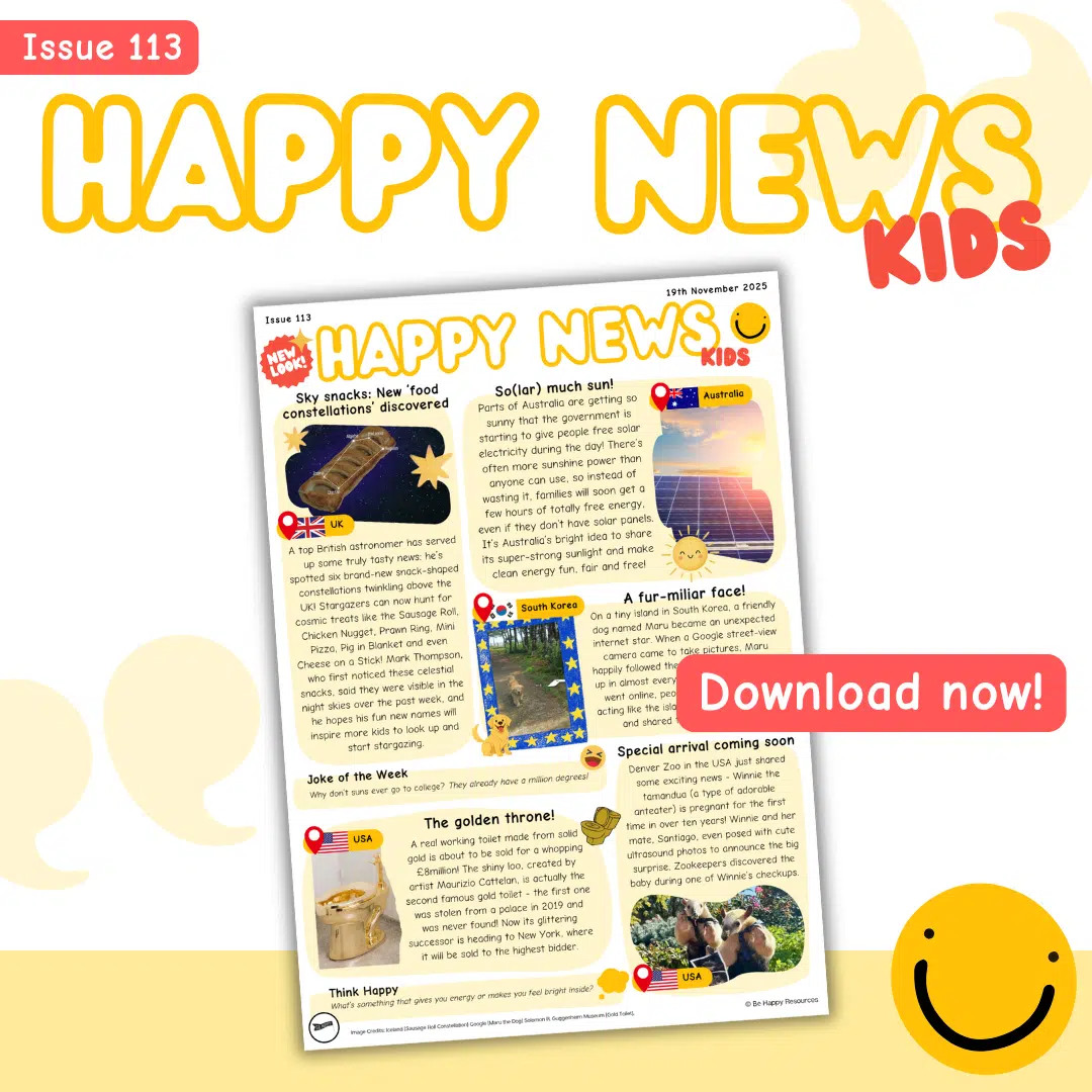 Welcome to Happy News! Our free weekly news leaflet for kids reports good news stories from across the globe. Did you know that as much as 90% of the news can be bad news? Children and teens often see or hear the news many times a day through various media channels, adult conversations and in the playground, so we set up Happy News to balance the bad with the good.