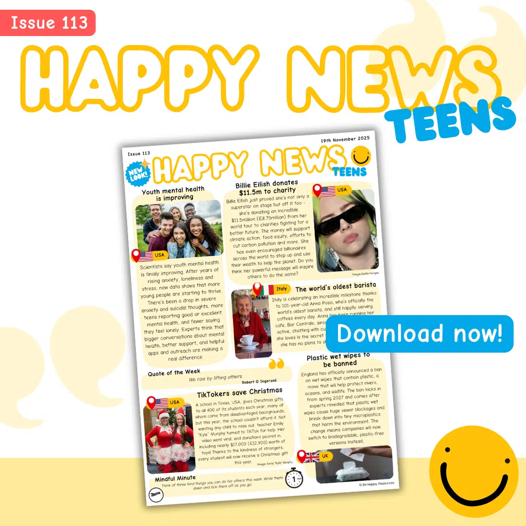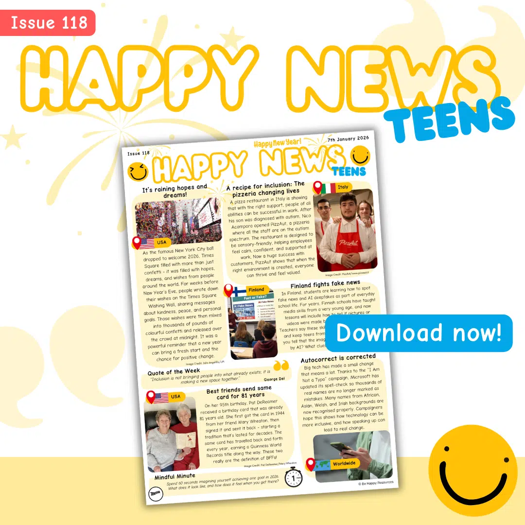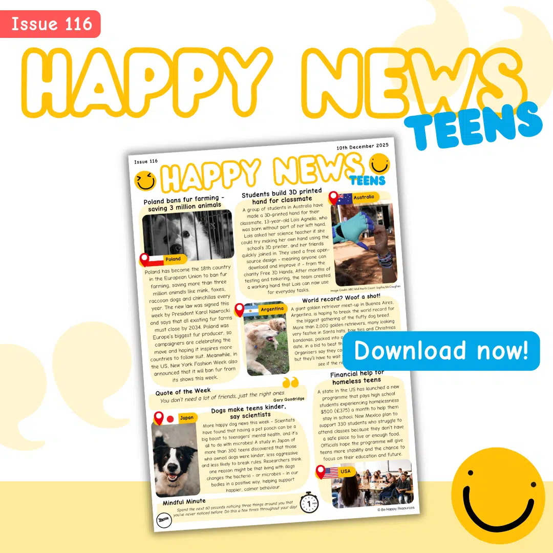 Welcome to Happy News! Our free weekly news leaflet for kids reports good news stories from across the globe. Did you know that as much as 90% of the news can be bad news? Children and teens often see or hear the news many times a day through various media channels, adult conversations and in the playground, so we set up Happy News to balance the bad with the good.