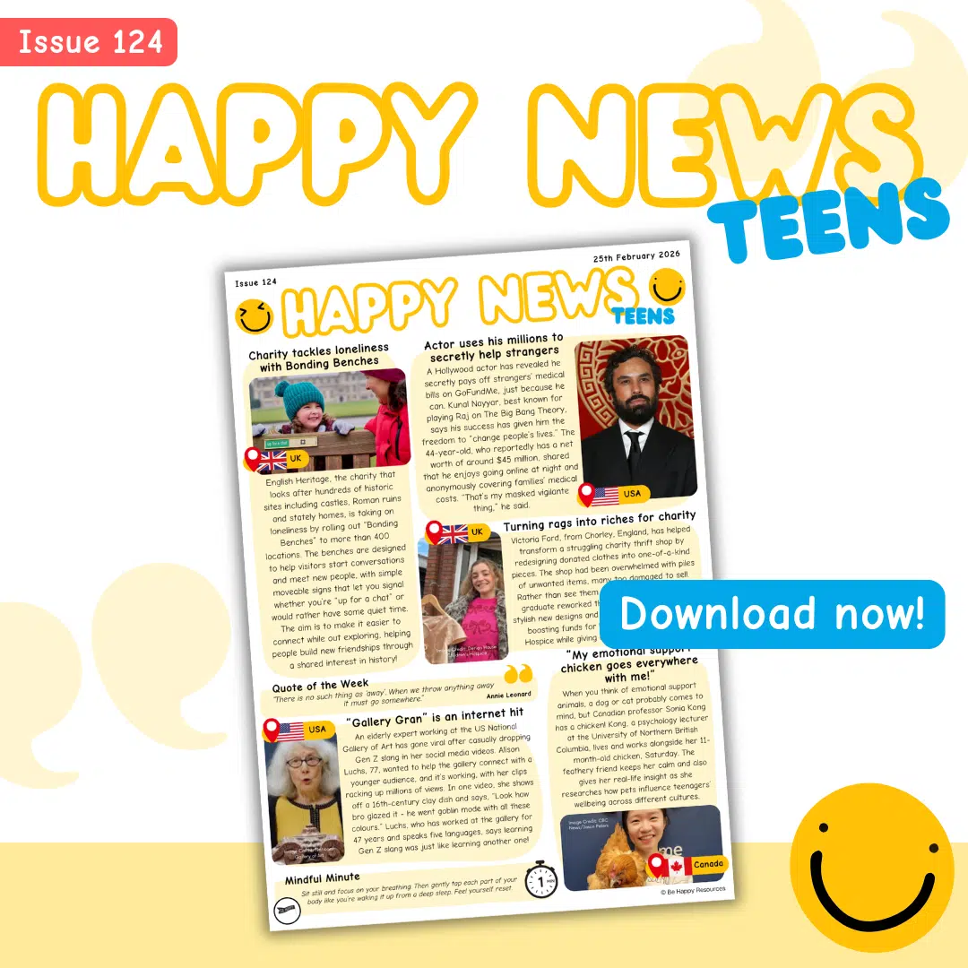 Welcome to Happy News! Our free weekly news leaflet for kids reports good news stories from across the globe. Did you know that as much as 90% of the news can be bad news? Children and teens often see or hear the news many times a day through various media channels, adult conversations and in the playground, so we set up Happy News to balance the bad with the good.